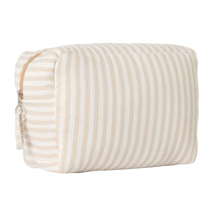Une trousse de toilette imperméable à la fois élégante et pratique ! Extérieur en gaze de coton rayé, intérieur en coton enduit.